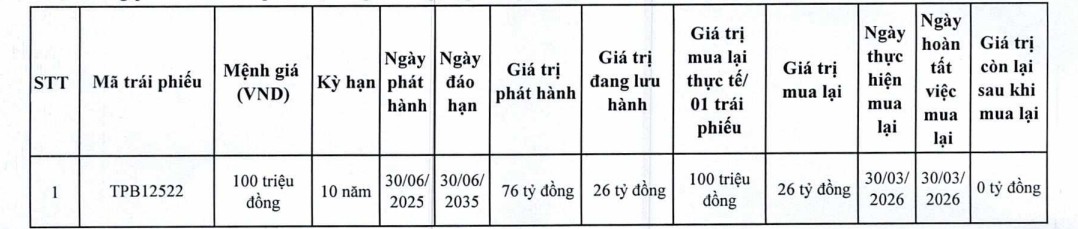 Cụ thể, ngày 30/3/2026, TPBank tiến hành mua lại 26 tỷ đồng trái phiếu mã TPB12522, qua đó tất toán xong lô trái phiếu này.